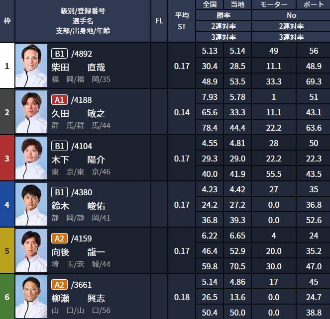 とくに1号艇の柴田は今節のスタートが遅めなので、2号艇にまくられた場合に下位へと転落する恐れがあるでしょう。
