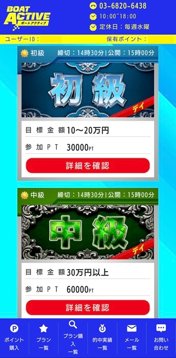 | 初級 | 単発1or2レース | 8点前後 | 1点2,000円 | 10万円~20万円 | 30000PT |