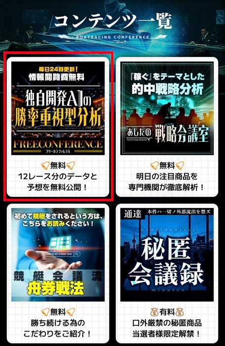無料予想に関してはサイト下部に存在するコンテンツ一覧か、右上のメニューボタンに存在する「フリーカンファレンス」から確認可能。