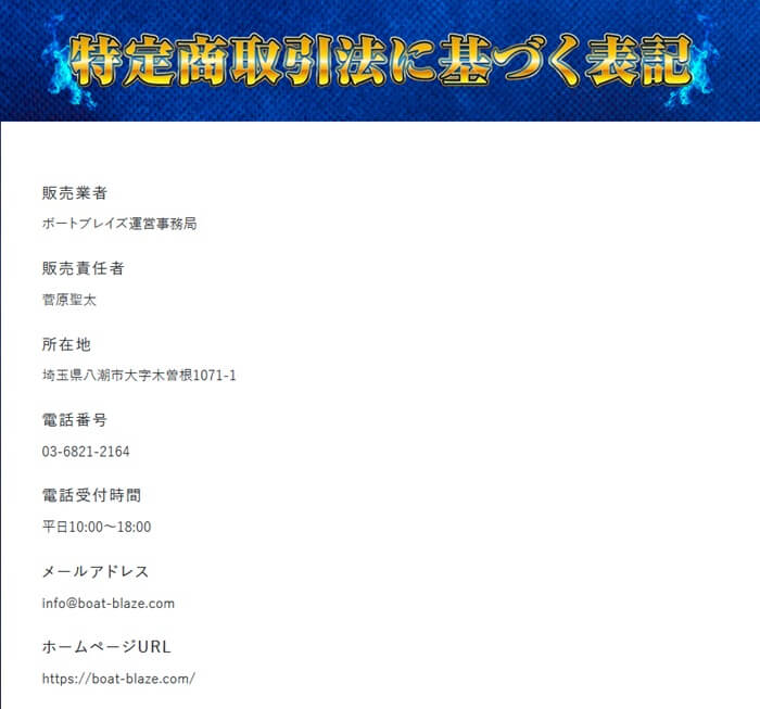 特商法に基づく表記を調べてみると、過去に検証した悪質競艇予想サイト「ボートアクティブ」と、同じく過去に検証した悪質競艇予想サイト「ファイナルボート」とのつながりを発見!