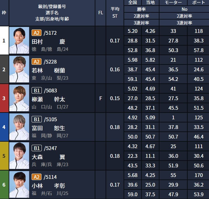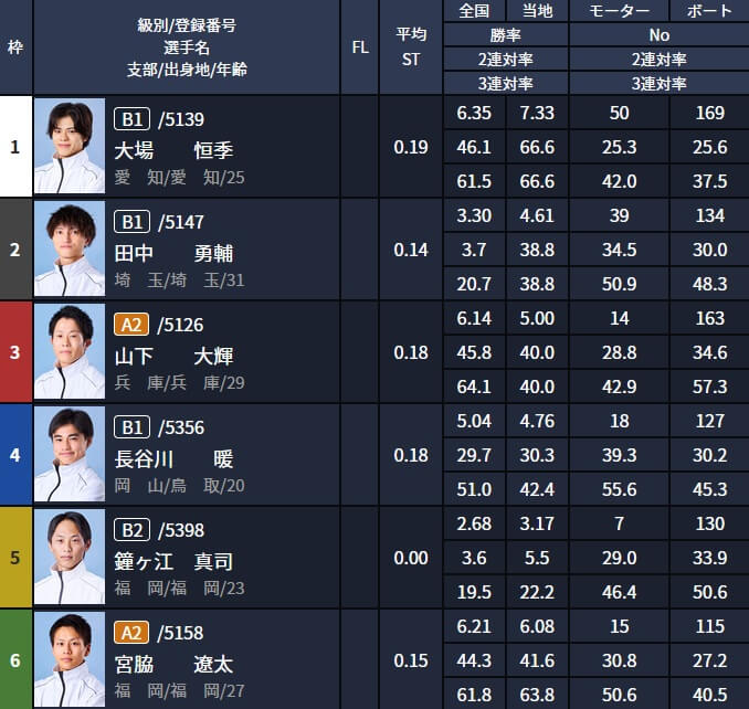 出走表を確認すると1号艇の田村慶と2号艇の若林樹蘭はA2級、4号艇の富田恕生は地元福岡のレーサーでモーターも強い・・・このサイトの買い目の選び方がわかってきましたね。