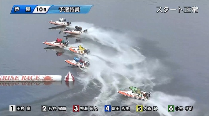 レースが始まるとピット離れで2号艇の若林が大幅に出遅れた影響で、スタートはスロー①③②/ダッシュ④⑤⑥の並びとなりました。
