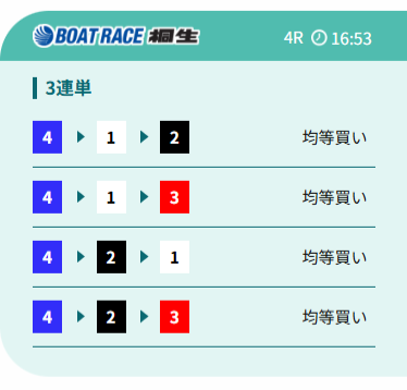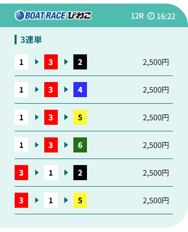 無料予想は最大20点との話でしたが、今回届いたのは最低点数の6点で1号艇を軸に3・4号艇をメインにした買い目でした。