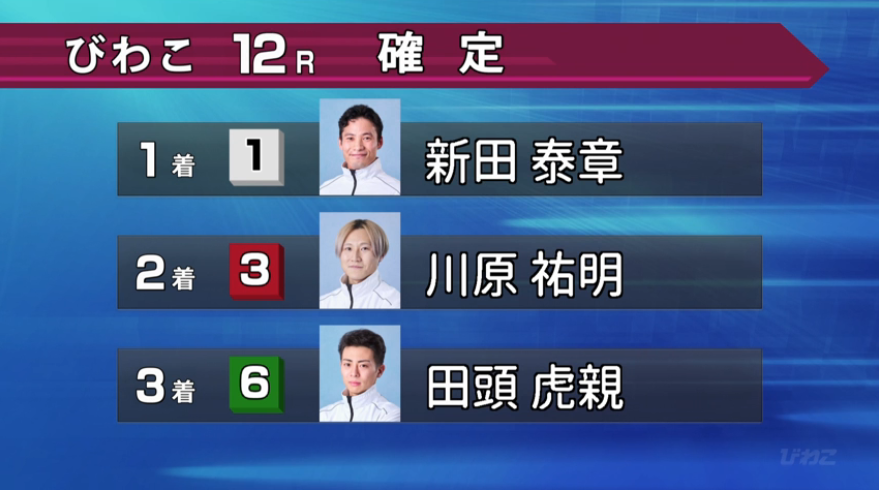 最速のスタートを切った1号艇の森永が「逃げ」、続いたのは2号艇の鶴田と3号艇の常盤となりましたが、こちらとしては「1-2-3」でも「1-3-2」でも的中となるので嬉しい限りです。