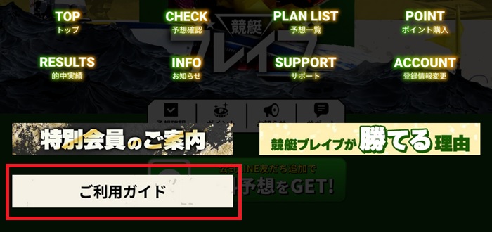 右上のメニューを開いてみると、そこには「ご利用ガイド」もあるので競艇予想サイトの使い方がわからないという人も安心!