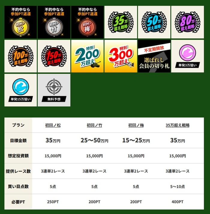 | プラン名 | 提供レース数 | 買い目点数 | 想定投資額 | 目標金額 | 必要PT | 備考 |