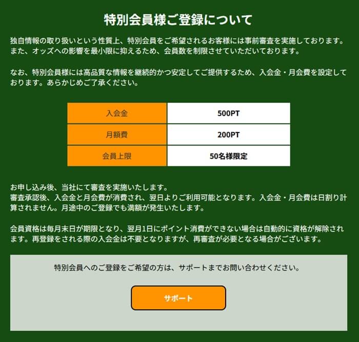 特別会員になるには「入会金500PT」「月額費200PT」「会員上限50名」などの条件が明示されていて、初めて見た人は「月額料金がかかるのか」と驚くことでしょう。