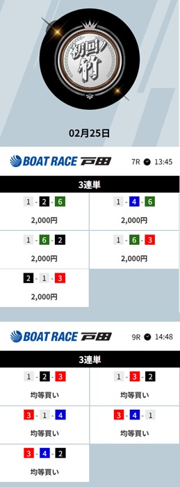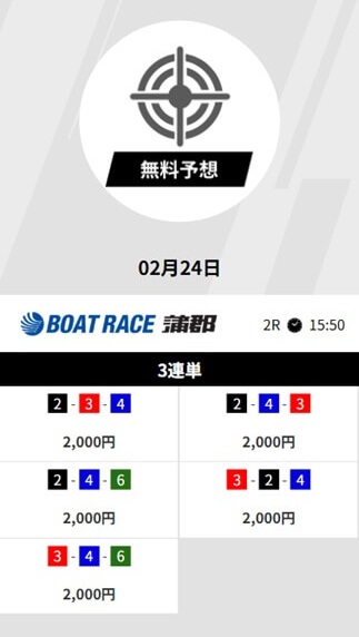 参加したのは2026年2月24日で、ボートレース蒲郡2Rの予想が届きました。