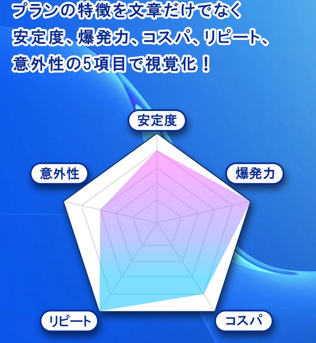 また、予想詳細の段で5項目・5段階のグラフによってプランの特徴を把握しやすくしていると語っていますが、こちらもクリアレーサーと一緒!