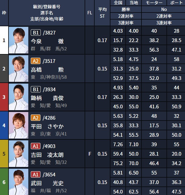 しかし、買い目から完全に排除されている2号艇にはA2級の高橋勲が乗っていて、同じくA2級で4号艇に乗っている平田さやか・1号艇に乗っているB1級の今泉徹よりも高橋の方が有望でしょう。