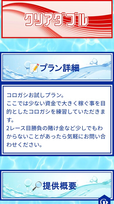 | クリアダブル | 2レースコロガシ | 8点 | 1点1,000円 | 10万円 | 150PT | チュートリアル |