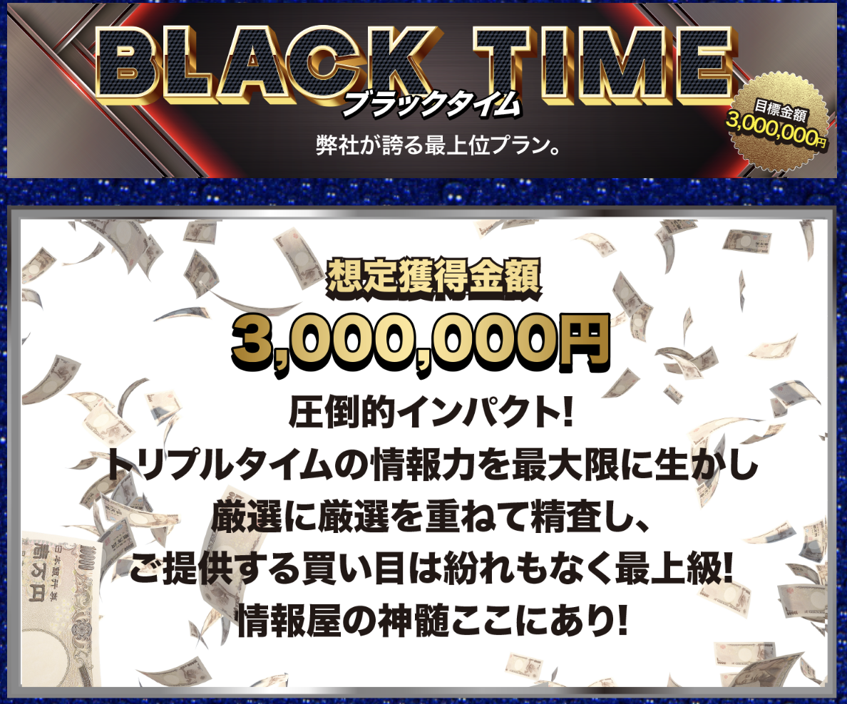 しかし、「ブラックタイム」の詳細ページの説明には、「圧倒的インパクト!トリプルタイム の情報力を最大限に生かし厳選に厳選を重ねて精査し、ご提供する買い目は紛れもなく最上級!情報屋の真髄ここにあり!」と書かれています。