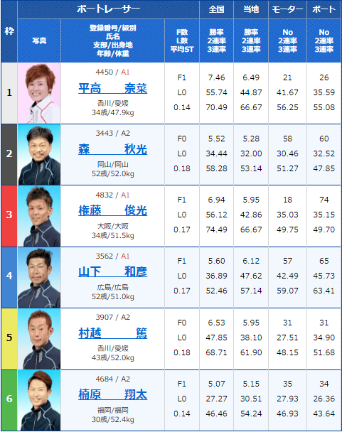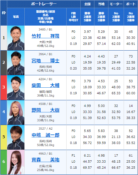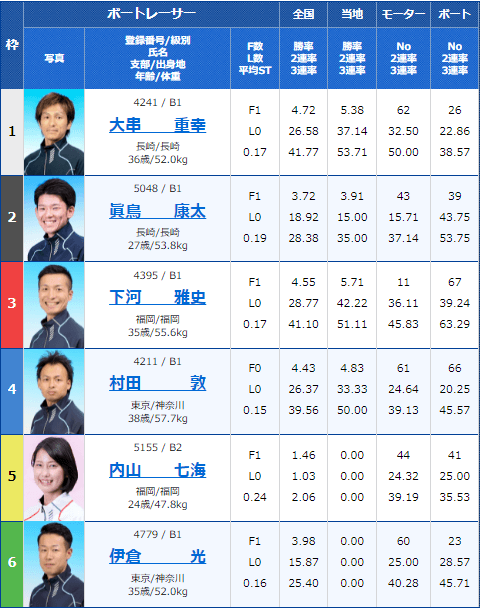 注目はセンターで、3号艇・下川雅史選手が当地での成績が良く、4号艇・村田敦選手は平均STが0.14とダントツで早いから、4号艇次第では、1マークでセンターが荒れる可能性がある。