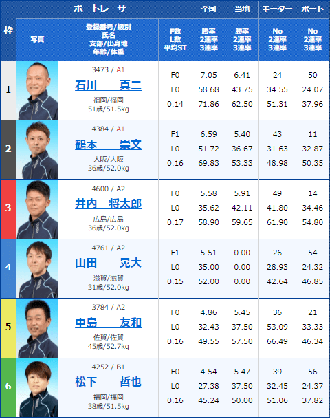 1号艇・石川真二選手の逃げ信頼して1着予想。