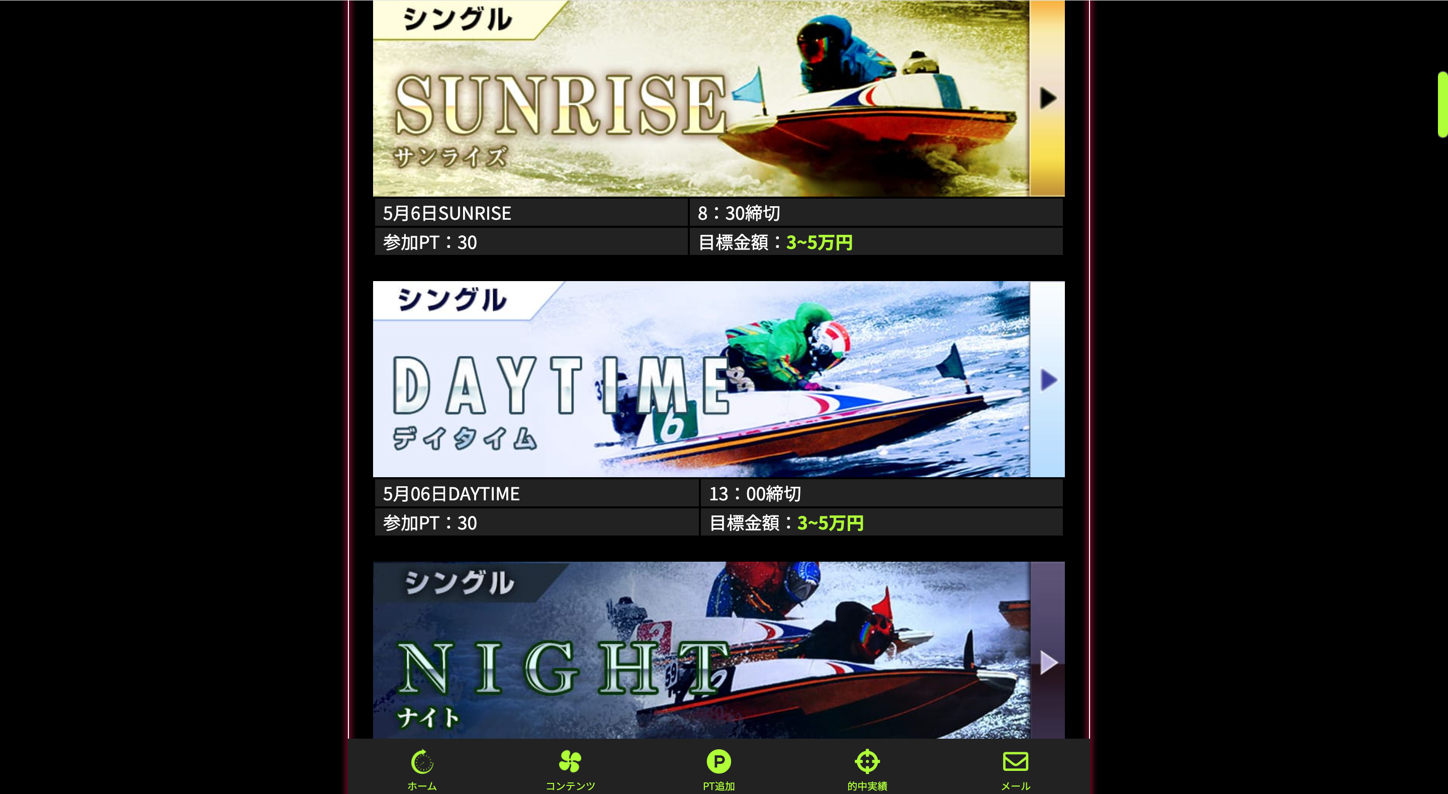 | シングルデイタイム | 1レース | 3連単 | 1万円 | 30pt | 3万円〜5万円 |