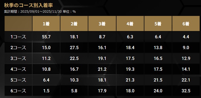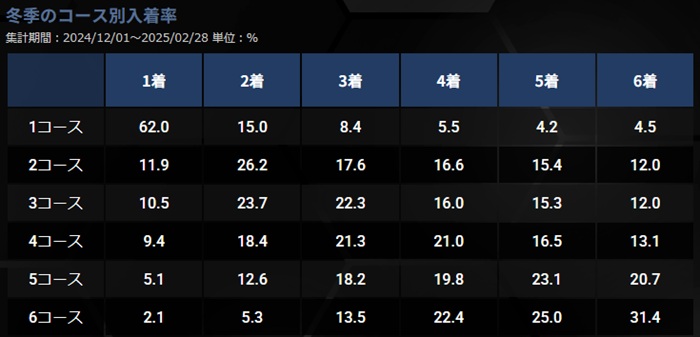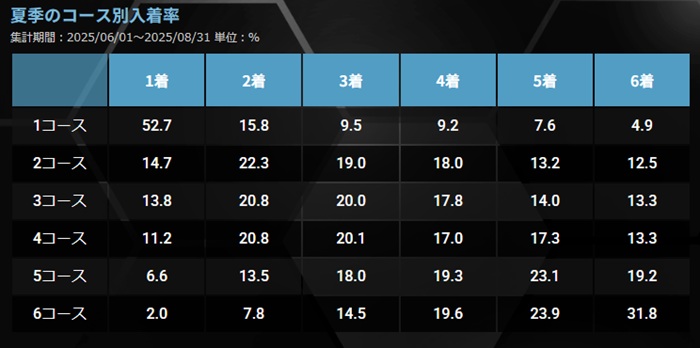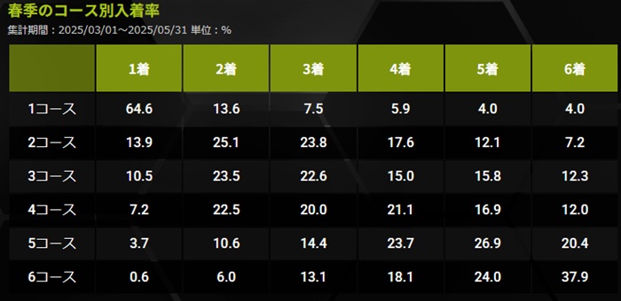 季節ごとの1コース1着率は「春:64.6%」「夏:52.7%」「秋:55.7%」「冬:62.0%」となっていて、最もインが強くなる季節は春。